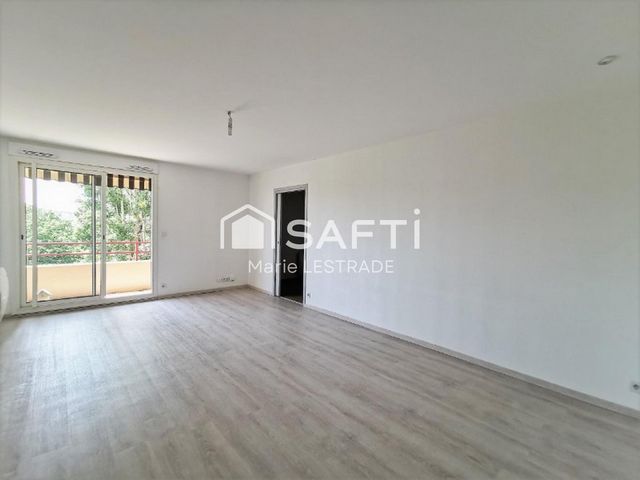 Le séjour s'ouvre sur un balcon ombragé grâce à un store avec une vue magnifique à plus de 180°sur la végétation et le parc jouxtant la résidence.